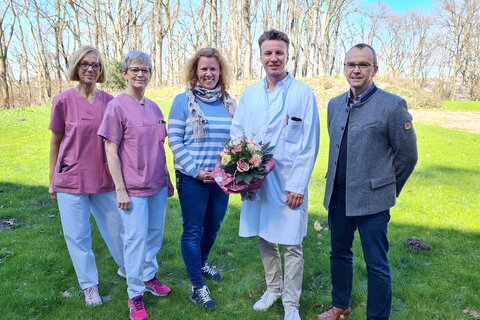 Foto: Conny Reichert (Ambulanz), Claudia Krause (Stationsleitung Wirbelsäulenchirurgie), Melanie Siemer (Pflegedienstleitung Orth. Klinik Volmarstein), PD Dr. Markus Konieczny (Chefarzt Wirbelsäulenchirurgie) und Matthias Mund (Kaufmännischer Bereichsleiter Orth. Klinik Volmarstein).