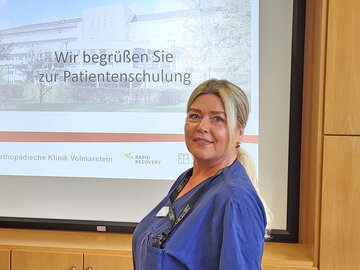 Unsere Rapid Recovery Koordinatorin Ute Merschmeier ist Ihre Ansprechpartnerin vor und während Ihres Klinikaufenthalts. In der Patientenschulung erklärt sie die Abläufe auf der Station.